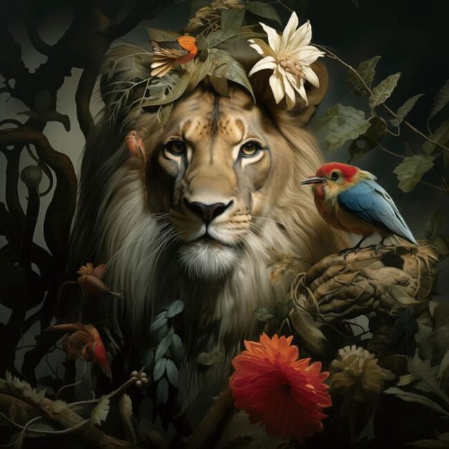 Glasschilderij 80x80cm Leeuw midden tussen planten