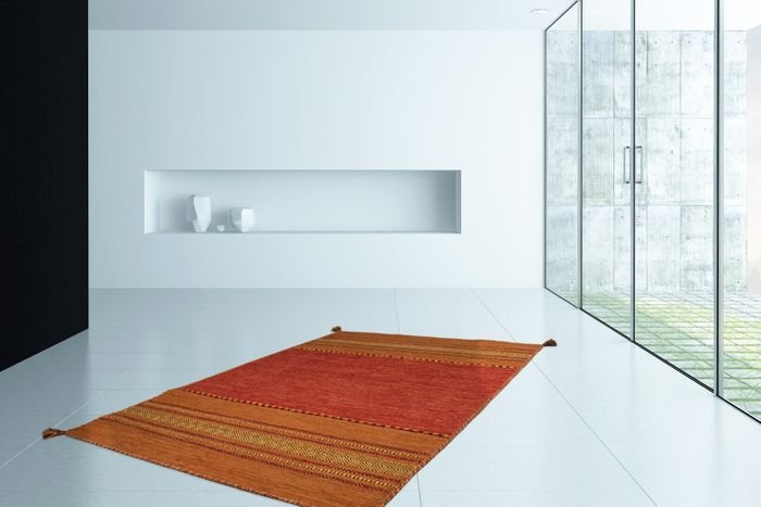 **Wool rug – in an ethnic look** Do you love variable patterns in your living area? Then this wool rug with subtle accents in dominant patterns could be the right one. The pretty terra color of this rug allows you to achieve a variety of effects. Its wonderful variety of colors and the high-quality material made of 100% cotton give this flat-woven rug an individual flair. What's more: the rug in an ethnic look is handmade – so you get an absolutely unique piece in any case! Contemporary and stylish with natural color design, this wool rug sets attractive accents in any living space. Put the few things that are particularly important to you in the foreground and make them an eye-catcher. In this way, you create a modern room that you can wonderfully enhance with a highlight like this wool rug. The dense, soft pile warms the whole room – thanks to the heat-insulating properties of the wool, even with cold tiles and in cool corners. The harmoniously coordinated colors bring the contrasting overall picture into harmonious harmony. The dreamy wool carpet is a subtle addition to a wide variety of rooms and is gentle on sensitive floors. Natural products can vary up to 30% in color and shape from the picture.