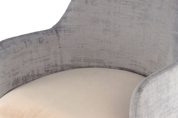 **Modern designer chair with two colors** This chair offers you a high level of seating comfort. A velvety soft fabric cover covers the seat with thick padding. This makes even longer sitting a pleasant experience. The backrest and armrests, which are also covered in fabric, increase comfort even further. The designer chair gets its special look from its two-part appearance. The seat shell and seat cushion are in different colors and material structures. While the seat cushion is plain and smooth, the fabric of the backrest has a light structure and provides a modern touch. Metal legs with lateral splaying complete the material composition and give the chair a stable stand. The exclusive design is particularly suitable for modern living spaces and can be integrated into different styles thanks to the different colors. The cozy chair is not only an eye-catcher in the living room or dining room. The designer chair can also be used in the bedroom or hallway and serve as a storage space, for example. The model is ideal for your very own reading corner. Thanks to its high level of comfort, you can create a cosy living area when combined with a small side table and an atmospheric floor lamp. The actual colour of the chair may differ from the pictures.