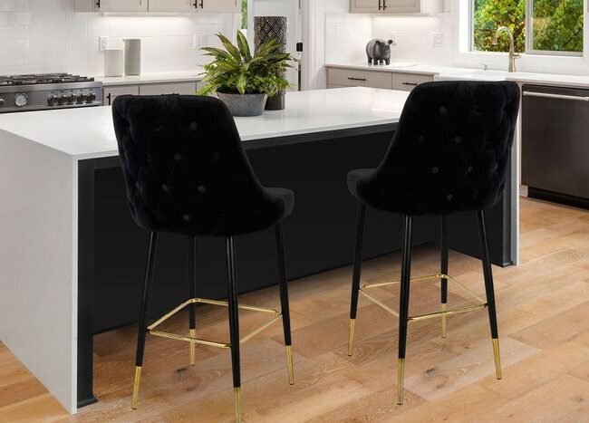 **Elegant stool for a bar feeling at home!** This bar stool is a real eye-catcher with its quilted backrest and timeless design. The footrest and the soft velvet cover over the padded seat and backrest ensure the right comfort. The stool comes in various colors that can be easily combined, so that the right model can be found for every interior. – velvety seat cover made of 100% polyester – comfortable padded seat – four modern colors – footrest provides additional comfort