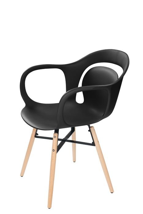 **Modern chair made of easy-care material** Bring this eye-catcher into your home. The combination of the striking shape and the mix of materials with wood and metal promises a modern piece of furniture that is an absolute eye-catcher. The simple color can be ideally combined with any prevailing interior style. The model can be used particularly well in the kitchen or dining room, because the material of the seat is extremely robust, easy to clean and hard-wearing. The chair retains its color for a long time thanks to the easy cleaning. The seat is complemented by backrests and armrests, so that the chair is also impressive in terms of comfort. You can provide additional comfort with a soft cushion. Regardless of whether you place the chair individually, in pairs or in groups, it cuts a fine figure in any living space and quickly becomes an eye-catcher. The actual color of the chair may differ from the pictures.