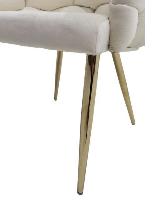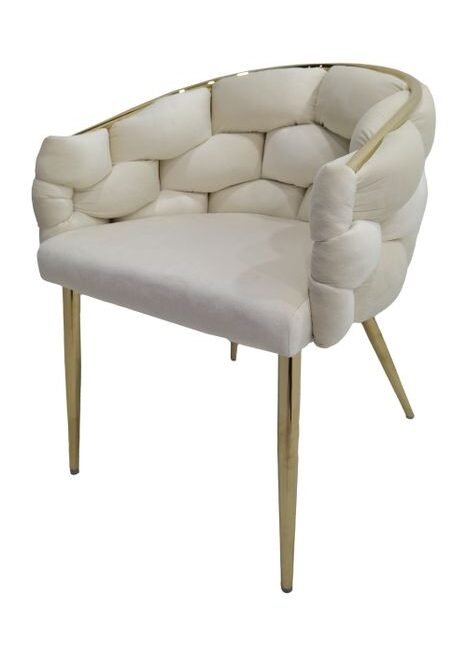 **Versatile luxury chair** Whether in the dining room, living room or lounge, this chair looks great: The backrest is particularly unusual with its woven look and is complemented by a padded round seat. The delicate chair legs are made of 100% metal and are particularly stable. The velvet cover makes the chair look particularly elegant. – stable metal frame – elegant velvet cover made of 100% polyester – unusual backrest