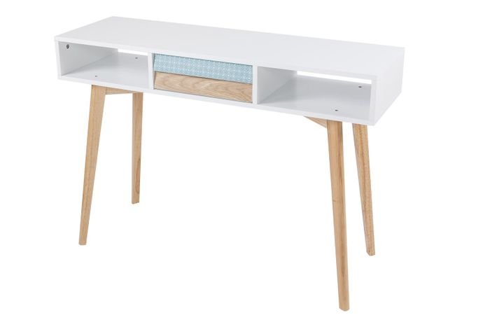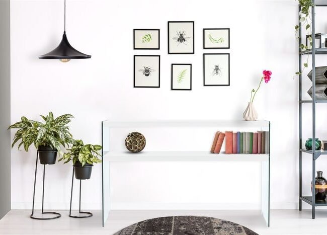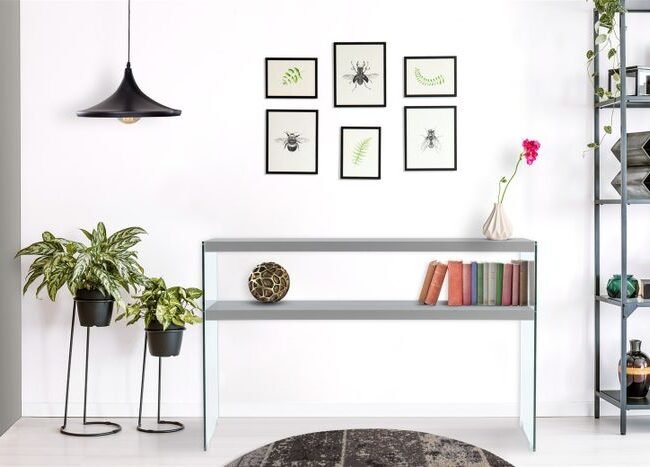 **Console table with a modern design** The modern design of this console table is characterized by the transparent glass side walls and the plain-colored shelves. At the same time, the design is unobtrusive and can be integrated into various furnishing styles. The console table is part of a furniture series, so that you can create a uniform, harmonious overall ambience in the room by combining it with other pieces of furniture. The console table is ideal for placing things that you would like to have close at hand. Whether as a table in the living room or as a shelf in the hallway – the table is versatile and a practical and decorative piece of furniture. Thanks to its narrow shape, it can be easily placed on the wall and takes up little space even in small and narrow rooms. Furnish your home stylishly with furniture from this furniture series and combine, for example, a console table and a shelf. The actual color of the piece of furniture may differ from the pictures.