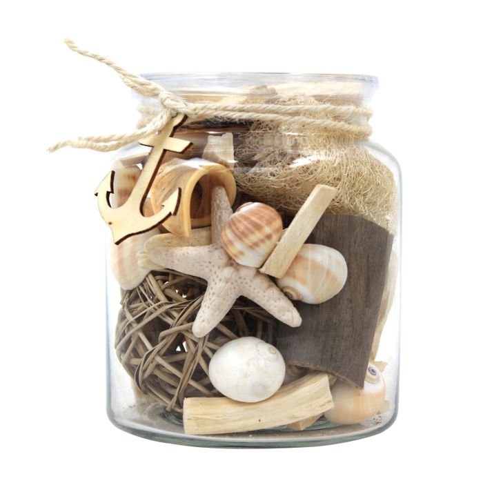 **Decorative glass for your home** This beautiful decorative glass is perfect for placing on tables, shelves or sideboards. It can be placed anywhere thanks to its beautiful size. The mix of dried plant parts with which the transparent glass is filled is decorated with a double cord on the edge. For your own home or as a gift – the simple design and natural colors fit perfectly into any interior and living space. Because it is handmade and made from natural materials, each glass is a unique, individually filled one-of-a-kind item that may differ from the picture.