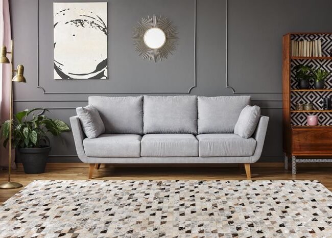 This model of carpet has some positive qualities. The pile was lovingly assembled by hand from many small square parts and is a unique piece. Natural leather pieces in different color gradations create a sophisticated patchwork pattern that quickly becomes an eye-catcher in the room. Metallic effects give the natural rug with fur an individual and modern look that can be combined with different furnishing styles. Home accessories made of leather or other natural materials as well as natural colors harmonize particularly well with the leather carpet.