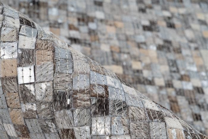 This model of carpet has some positive qualities. The pile was lovingly assembled by hand from many small square parts and is a unique piece. Natural leather pieces in different color gradations create a sophisticated patchwork pattern that quickly becomes an eye-catcher in the room. Metallic effects give the natural rug with fur an individual and modern look that can be combined with different furnishing styles. Home accessories made of leather or other natural materials as well as natural colors harmonize particularly well with the leather carpet.