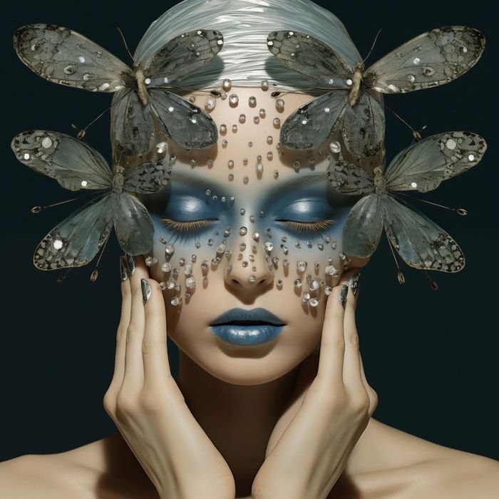 Glasschilderij 80x80cm Vrouw met vlinders en diamanten