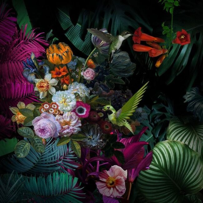 Login to see pricesGlasschilderij 80x80cm Kolibries in bloemenzee