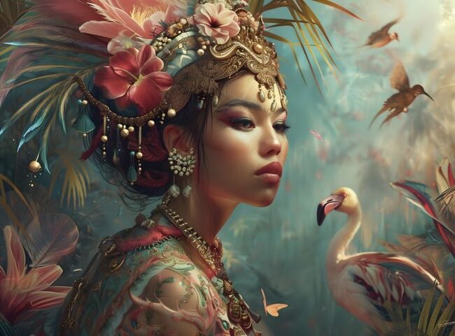 Glasschilderij 160x110cm Versierde vrouw met flamingo