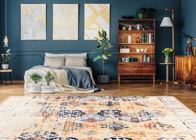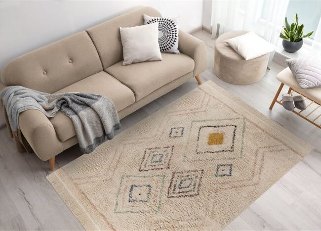 Flat-woven carpet with relief design, used look, modern colors