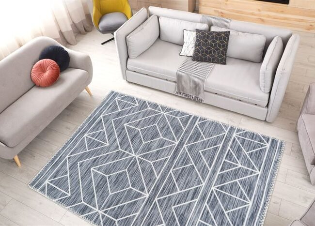 **Carpet with a tasteful 3D structure** This high-quality flat-woven carpet is particularly eye-catching thanks to its simple relief design in two different colors. The used look does the rest and gives the 8mm short pile its special appearance. The quality of the machine-woven unique piece is also particularly high – a carpet with which you can't go wrong! Specifications: • Available colors: gray / blue / orange / yellow • Pile height: approx. 8mm • Material: 100% polyester • Size: 80cm x 150cm / 120cm x 170cm / 160cm x 230cm
