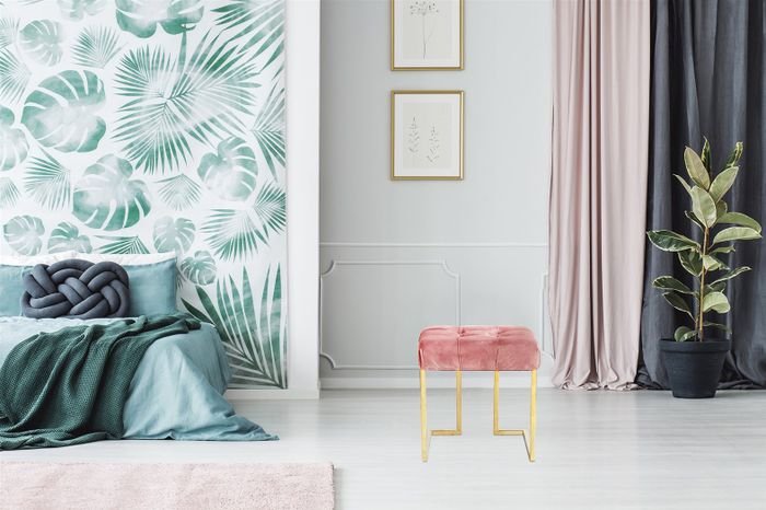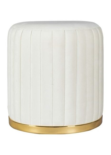quilted and invites you to linger comfortably. The golden, square metal frame gives the stool a modern look