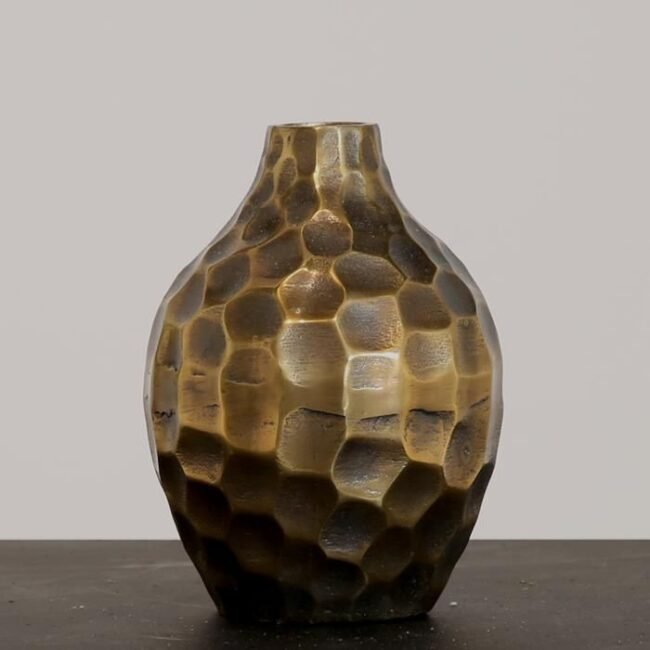<p>The decorative vase Dentro is a stylish podium for your bouquet of dried or silk flowers and branches. The carved pattern in the vase gives it a unique look. Perfect for on a side table, or as an eye catcher in a windowsill or on a pillar. Made from thick metal with a dark brass coating, the vase is robust and easily cleaned with a damp cloth. Note: The vase is not suitable for fresh flowers without a plastic or glass inner container.</p>