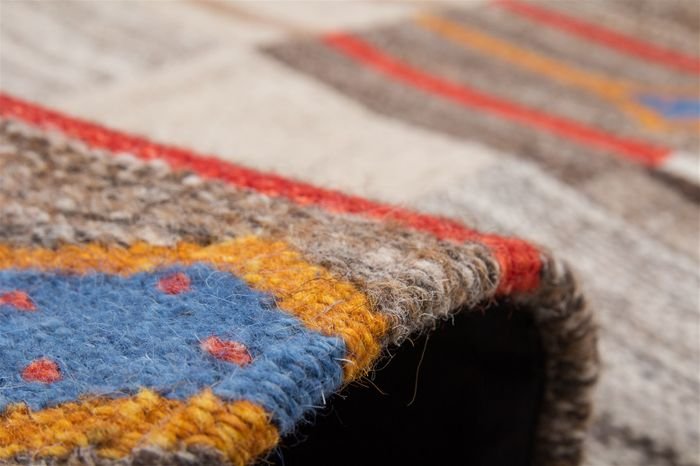 **Natural carpet in patchwork design** The trendy patchwork design makes this handmade carpet a unique one-of-a-kind. None of the jacquard kilims are the same. The harmonious color combination adds dynamism to your living space and quickly becomes a beautiful eye-catcher, no matter which room you use the natural carpet in. The carpet is also impressive in terms of feel. The material combination of wool and cotton is very durable and therefore particularly easy to care for and clean. At the same time, the carpet is beautifully light, which means that you can redesign a room in no time at all. Add some pep to your living style and complement your modern or classic furnishings with this carpet model. The dense pile of the natural product flatters your feet, gives you a pleasant living feeling and at the same time provides good insulation.