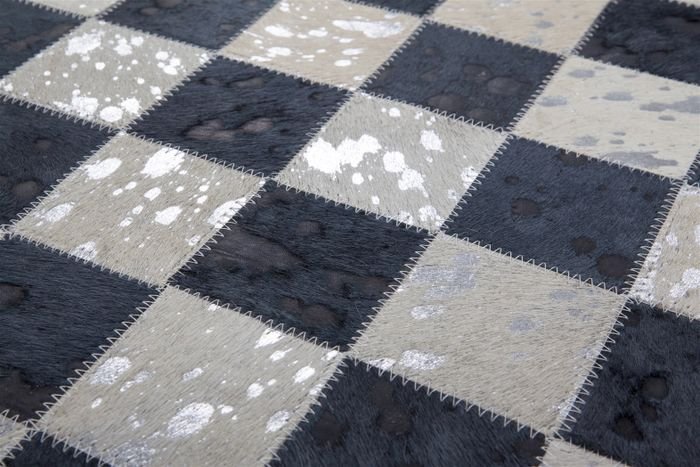 Metallic applications on genuine leather with soft hair characterize this carpet. Bring the individual eye-catcher home and your visitors will be amazed. The basis of the leather carpet in a patchwork design is formed by different nuances of a color. The printed metallic foil is the special highlight of the carpet, sets accents and makes the carpet shine.