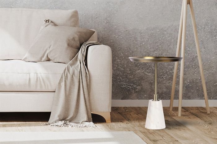 **Side table with marble base in an elegant design** Elegant design and unique character are combined in this side table. It impresses with the interplay of materials used. Marble, iron and aluminum create a high-quality overall image and set accents. The table not only serves as a stand-alone decorative object, but also as the basis for other furnishings. Its variety of combinations is unparalleled. Used correctly, it unfolds its full potential and becomes an eye-catcher in the design of interiors. It is handmade and uses only high-quality materials. Thanks to its marble base, it is stable and its robust support surface offers space for further ideas. These want to be noticed and perceived by the viewer. Available in various color combinations, it fits seamlessly into the existing interior design. Note: Marble is a natural stone, the color and marbling of which can always differ from the image. Each product is unique.