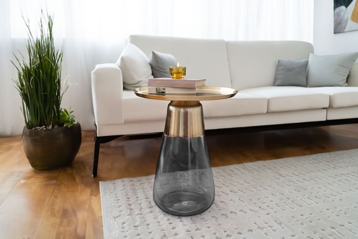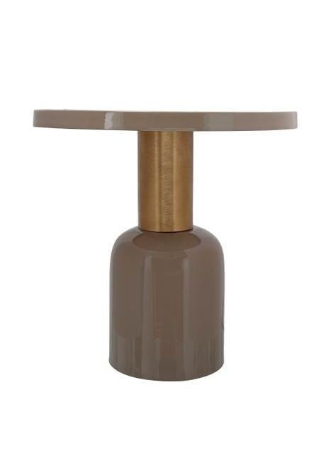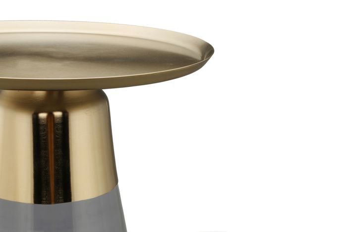 **Superlative handcrafted glass side table** This side table gives you a glamorous and futuristic ambience in retro style. The hand-blown glass frame, covered with the golden metal table top, gives the table its very special, unmistakable style. Whether as a side table, coffee table or eye-catcher. This table impresses with its cylinder-like base and the shiny gold table top for all things that should be within easy reach. Use the futuristic effect of this table and consciously use it as decoration. No matter how you want to use the table, it offers a wide range of design and usage options. The stylish design, the lavish frame and the elegant combination of glass and metal give the table its special and trendy character. The golden metal table top can be easily wiped off if it gets dirty. Thanks to its attractive shape, it can be placed not only in the room or on the wall, but also in a corner. Thanks to its unmistakable design, it can unfold its full elegant effect in any room. Available in green/gold, pink/gold, blue/gold and grey/gold. Also available in other combinable designs. The actual colour of the table may differ from the pictures.