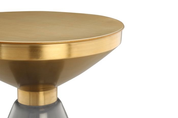 **Retro table made of hand-blown glass body** With this side table you get an elegant and futuristic ambience in retro style. The hand-blown glass frame, covered with the wide, golden metal table top, gives the table its very special, unmistakable style. Whether as a side table, coffee table or eye-catcher. This table impresses with its funnel-like base and the golden metal table top for all things that should be within easy reach. Use the futuristic effect of this table and consciously use it as decoration. No matter how you want to use the table, it offers a wide range of design and usage options. The stylish design, the lavish frame and the elegant combination of glass and metal give the table its special and trendy character. The golden metal table top can be easily wiped off if it gets dirty. Thanks to its attractive shape, it can be placed not only in the room or on the wall, but also in a corner. Thanks to its unmistakable design, it can unfold its full elegant effect in any room. Available in green/gold, pink/gold, blue/gold and grey/gold. Also available in other combinable designs. The actual colour of the table may differ from the pictures.