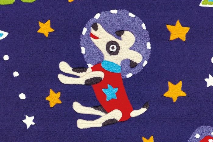 **Children's rug with luminous yarn** This short-pile children's rug is an eye-catcher in every child's room. The colorful and child-friendly design is a real eye-catcher in itself. The highlight is the elements made of PES yarn, which are fluorescent and glow in the dark. So when the light is turned off, the child's room is not completely dark, because the short-pile rug emits a light, pleasant light. Make your children's eyes shine and put a luminous rug in the child's room. The soft acrylic pile is ideal as a play mat, because it not only has a child-friendly design, but is also extremely easy to care for thanks to the material. The acrylic material is reinforced by a back made of polyester and cotton. The rug can also be placed in rooms with underfloor heating without any problem.
