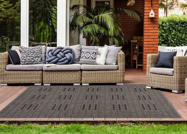 This robust outdoor rug adds Mediterranean accents to any living area.