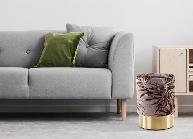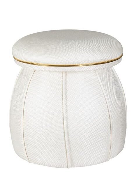 **Round pouf with metal element** This stool combines a modern round shape with a contemporary two-tone color scheme, which are visually separated from each other by an elegant metal ring. The glamorous look is intensified by the velvety soft fabric cover. In combination with the softly padded seat, the stool is a comfortable seat for any room. Thanks to the low seat height, it is ideal for integration into the living area in the living room, but also as a practical stool for putting on and taking off shoes in the hallway. No matter which room you use the stool in, it will be an attractive eye-catcher. The actual color of the piece of furniture may differ from the pictures. Different color nuances can arise due to different incidence of light and different stroke directions of the fabric cover.