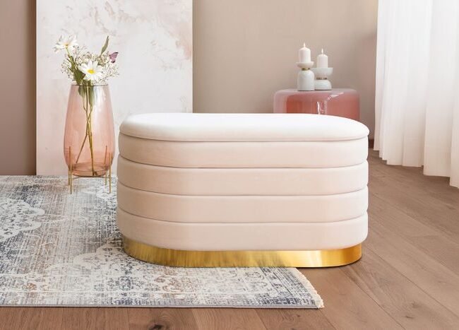 **Pouf with an elegant frame** This round stool offers pleasant seating comfort thanks to its soft feel and elegant fabric cover. The pouf is not only an attractive piece of furniture in terms of appearance. The timeless yet striking design with elegant metal elements makes the stool an eye-catcher in every room and brings elegance and a feel-good character. No matter where you put the stool – it will quickly become an eye-catcher in your living room. The actual color of the piece of furniture may differ slightly from the pictures. Different color nuances can arise due to different incidence of light and different stroke directions of the fabric cover.