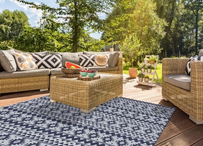 **Outdoor carpet in a vintage look** The robust carpet can be used in a variety of ways both indoors and outdoors. The material made of 100% polyester is dimensionally stable and tear-resistant and therefore suitable for heavy use. It promises a long service life even when used outdoors. The good quality of the material is also weather-resistant – neither strong sunlight nor rain affect the color intensity of the carpet. The outdoor carpet hardly absorbs moisture, so it is easy to clean and dries quickly. Whether you put the carpet on your terrace, balcony or indoors – it retains its shape and color for a long time. The easy-care and durable material is also particularly suitable for use in the kitchen, entrance area or bathroom and can also be placed on underfloor heating. In addition to the good quality and feel, the carpet also looks good. The modern design is combined with washes that give the carpet a trendy vintage look. The simple colors of the handmade carpet can be perfectly combined with your home furnishings or a variety of garden furniture. To ensure that there is something suitable for you, the outdoor carpet is available in various colors and sizes. Due to the handcrafting, there may be slight deviations in color, pattern and size.