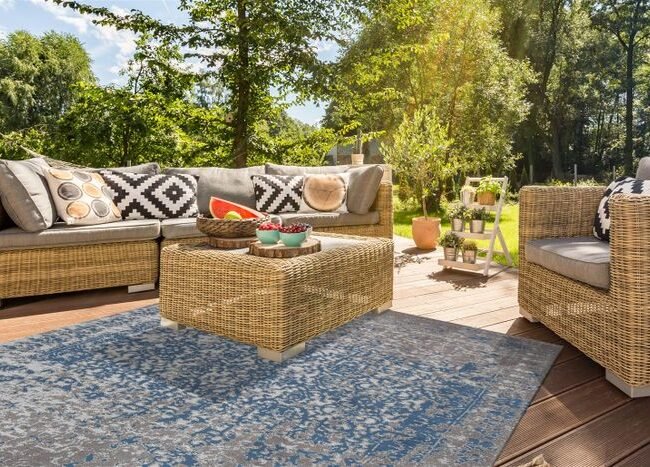 **Outdoor carpet in a vintage look** The robust carpet can be used in a variety of ways both indoors and outdoors. The material made of 100% polyester is dimensionally stable and tear-resistant and therefore suitable for heavy use. It promises a long service life even when used outdoors. The good quality of the material is also weather-resistant – neither strong sunlight nor rain affect the color intensity of the carpet. The outdoor carpet hardly absorbs moisture, so it is easy to clean and dries quickly. Whether you put the carpet on your terrace, balcony or indoors – it retains its shape and color for a long time. The easy-care and durable material is also particularly suitable for use in the kitchen, entrance area or bathroom and can also be placed on underfloor heating. In addition to the good quality and feel, the carpet also looks good. The modern design is combined with washes that give the carpet a trendy vintage look. The simple colors of the handmade carpet can be perfectly combined with your home furnishings or a variety of garden furniture. To ensure that there is something suitable for you, the outdoor carpet is available in various colors and sizes. Due to the handcrafting, there may be slight deviations in color, pattern and size.