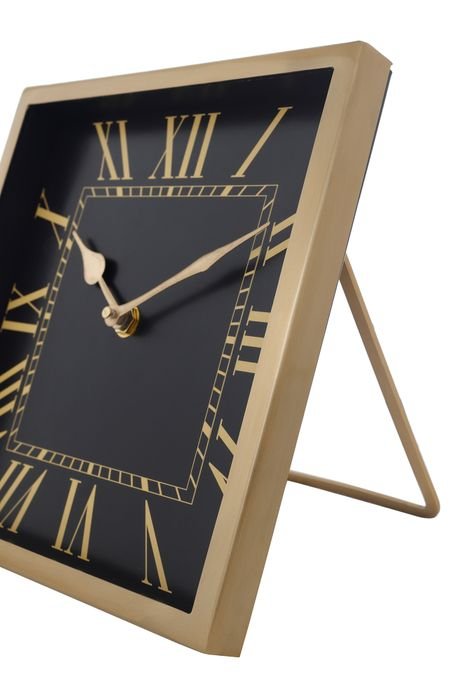 This decorative table clock presents itself in a trendy vintage design, where it is precisely the angular shape that stylishly rounds off the look. Thanks to the interaction of the black dial and shiny metal frame, the fashionable decorative it-piece gives any room an elegant touch. The Roman numerals also contribute to this, as their metallic look contrasts with the dark dial. Whether in the kitchen, living room or hallway, the table clock with vintage charm is a stylish eye-catcher everywhere, meaning you are always up to date.