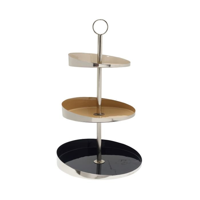 **Very classy served!** This elegant cake stand is a great eye-catcher in any room. The handcrafted iron construction is painted in a beautiful gold-colored effect and has three color-coordinated plates. This cake stand is both practical and decorative and is perfect for displaying your favorite decorations and accessories. Every unevenness in this collection, every little flaw, is proof of the handwork, care and love with which it was made and therefore does not represent a production defect.