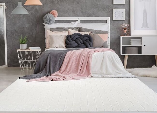 The special look of this shaggy rug is characterized by the attractive embossed pattern, which creates an attractive 3D effect. The geometric shapes of the pattern also give the carpet a stylish retro character. The otherwise simple and monochrome pile can be seen in any living space and can be combined with any interior thanks to its simple elegance. The cozy surface creates a cozy atmosphere in the room. The carpet can also be easily laid out in rooms with underfloor heating.