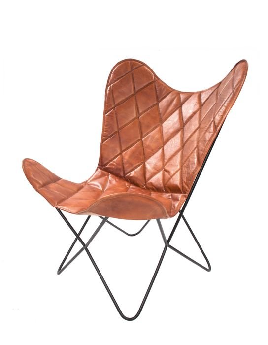 **Butterfly chair with checkered pattern – handmade from leather** With this exclusive piece of furniture you have a real eye-catcher. The natural leather cuts a fine figure on the robust metal frame and is also extremely comfortable. The modern pattern of decorative seams is perfect for modern interiors as well as for classic or rustic living spaces. Combine a beautiful side table and creative home accessories with the butterfly chair and create your very own oasis of peace. Another advantage of the material is its robust stability and easy cleaning. Natural products can vary up to 30% in appearance, shape and color from the picture and description. The actual color of the chair may vary from the images.